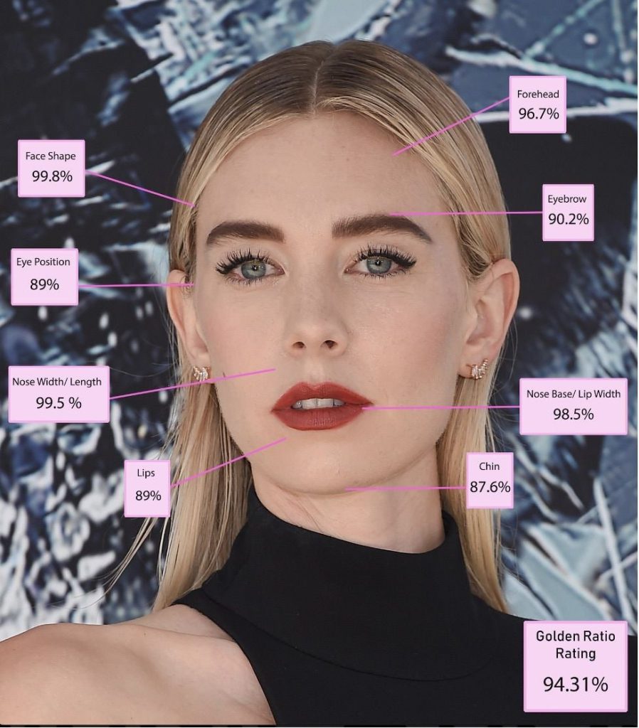 Uchinchi o‘rinni egallagan britaniyalik aktrisa Vanessa Kirbi esa eng mukammal yuz shakli bilan 99,8% ko‘rsatkichga erishgan.