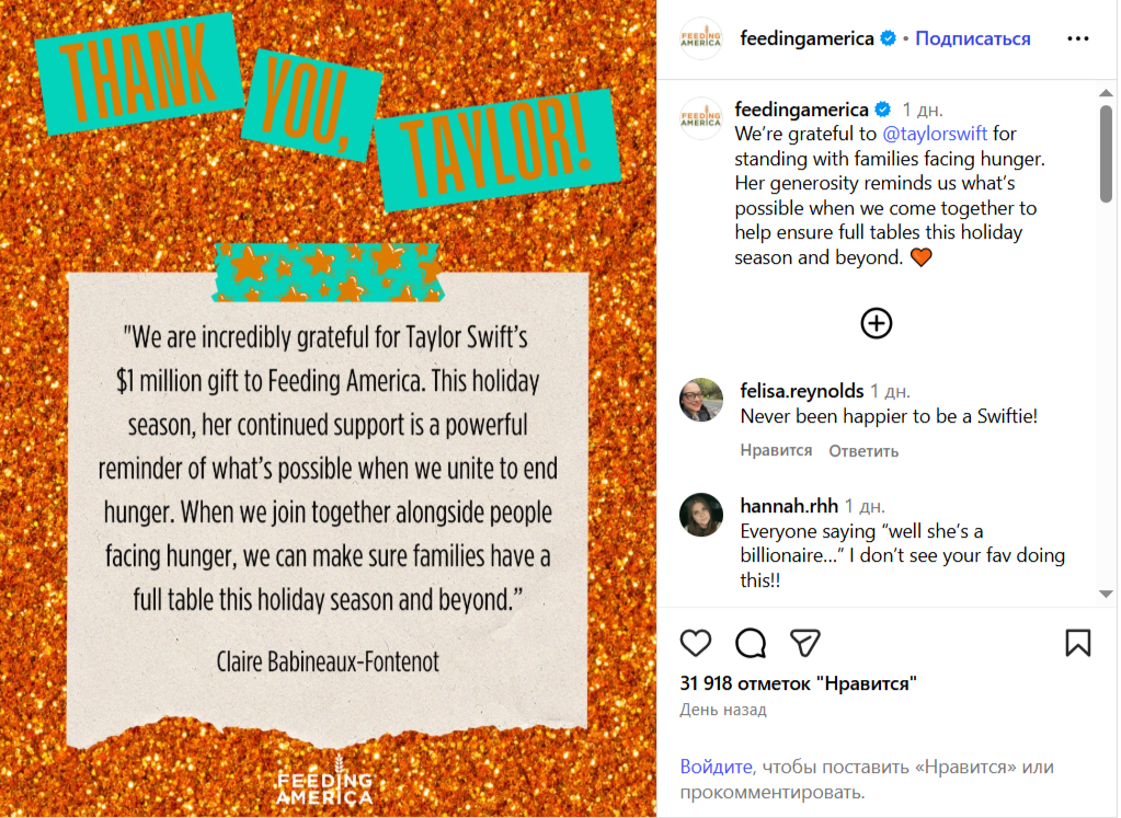 Ma’lumotlarga ko‘ra, bir necha bor “Gremmi” mukofotiga sazovor bo‘lgan Teylor Svift bu yirik xayriyani Rojdestvo bayrami arafasida amalga oshirgan. Ushbu mablag‘ bayram kunlarida va undan keyingi davrda minglab oilalarga yordam berishga xizmat qiladi.